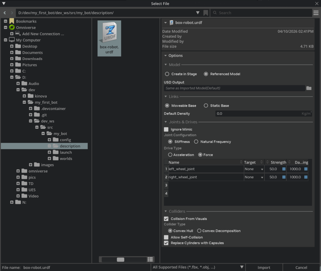 When that’s done, we end up with a single, flat box-robot.urdf file that we can now import into Isaac Sim!