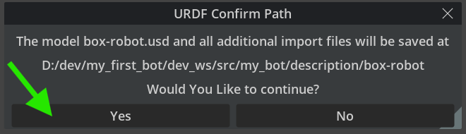 When you hit import, you’ll automatically convert the URDF into USD at the path that you defined under “USD Output”, or it will land in the same location as our URDF file, so just confirm that location by hitting “Yes” in the dialogue window.
