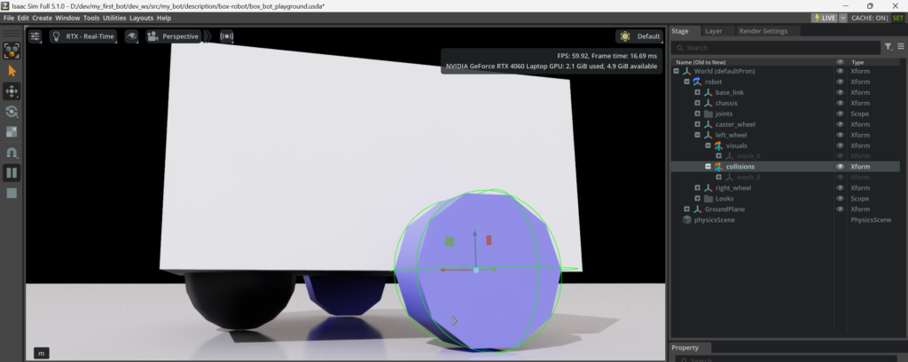 Before we do that, here’s a screenshot showing the collision mesh selected and the simulation running so you can see how our rough polygon wheels sit slightly off the ground. That’s because Isaac Sim is using the collision mesh to calculate physics and not the visual wheel, ensuring our robot will roll smoothly.