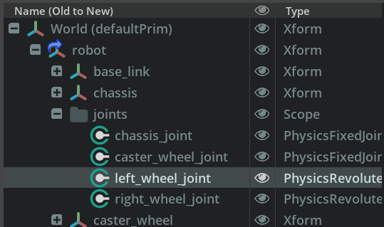 In the Stage, navigate to joints and select the left_wheel_joint.