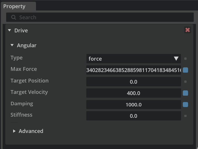 In the Property panel, set the Target Velocity to 400 and the Damping to 1000. We need both of these set to ensure the revolute joint mimics a motor.